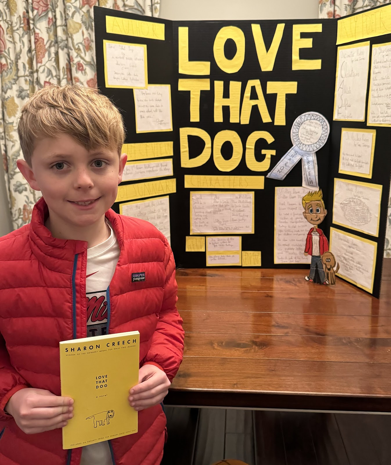 Case did his reading fair project on Love That Dog by Sharon Creech. I hope he wins! He worked really hard! Notice his own poetry 😜